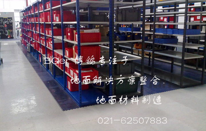 采用藍色和灰色工業(yè)地板磚鋪裝,灰色地板鋪設(shè)行走空間,藍色安裝在貨物和物料去,在貨架安放區(qū)域。